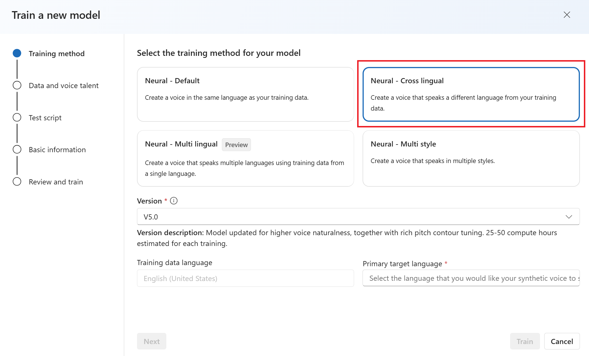 • Neural - cross lingual: Create a voice that speaks a different language from your training data. For example, with the fr-FR training data, you can create a voice that speaks en-US.
