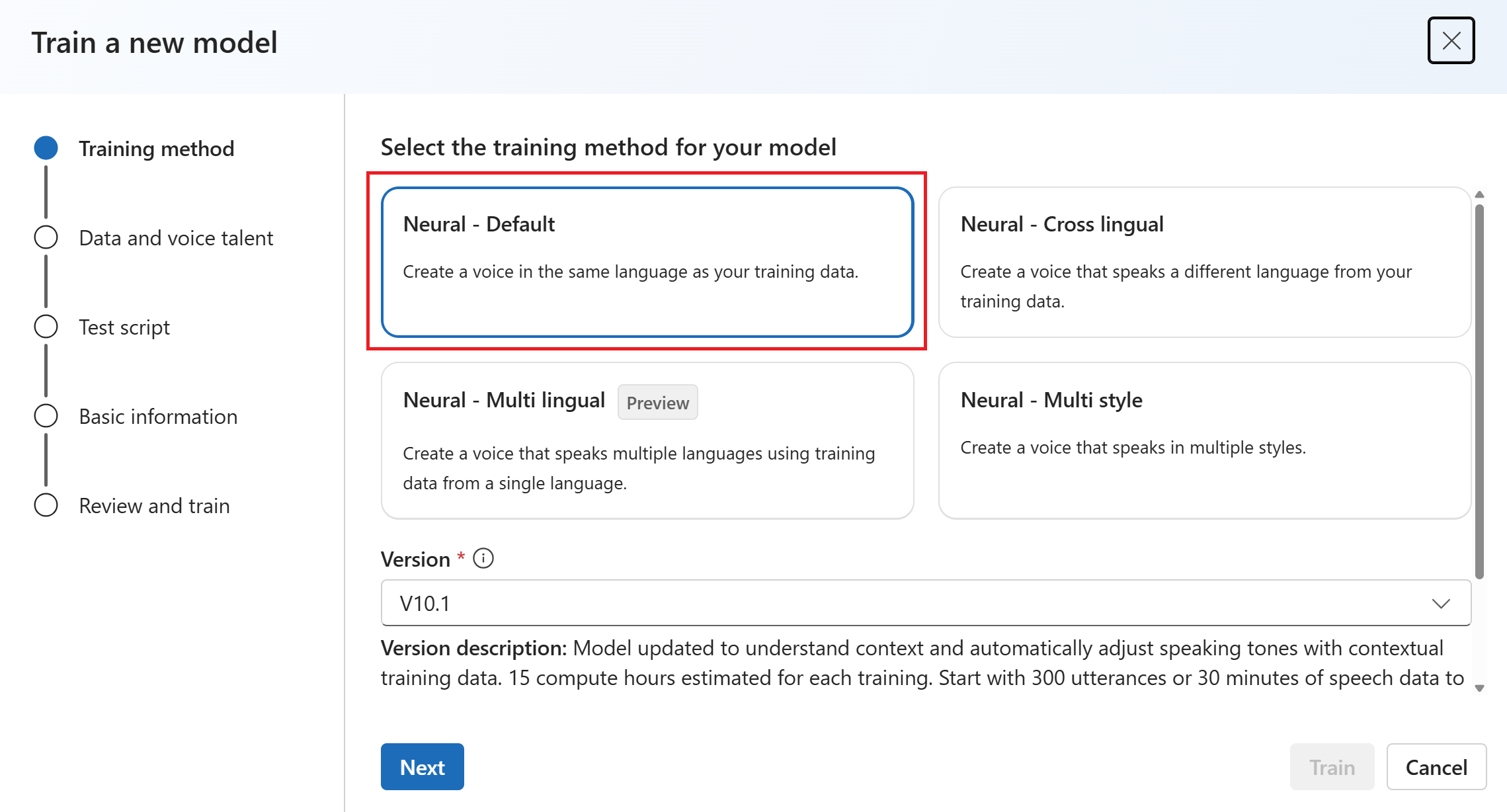 5. Select Neural as the training method for your model. To use a different training method, see Neural - cross lingual, Neural - multi style, Neural - multi lingual (preview), or Neural - HD Voice (preview).