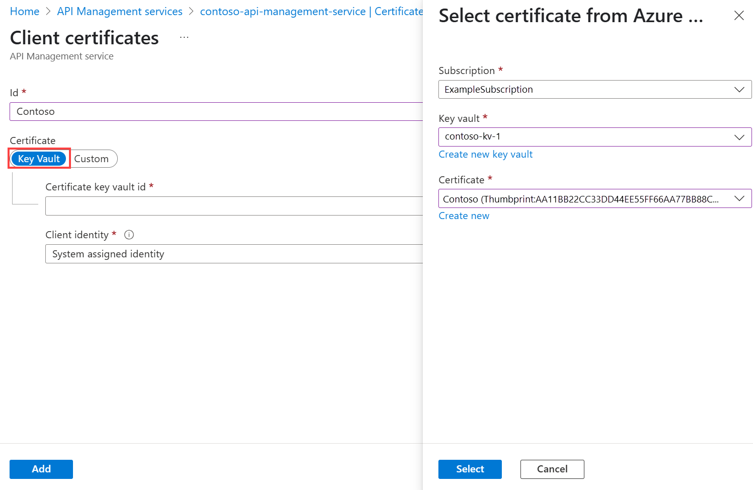 Enter the identifier of a key vault certificate, or choose Select to select a certificate from a key vault.