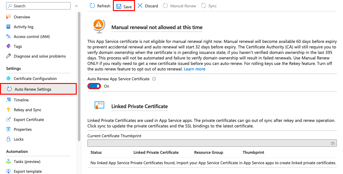 If you turn on automatic renewal, certificates can start automatically renewing 32 days before expiration.