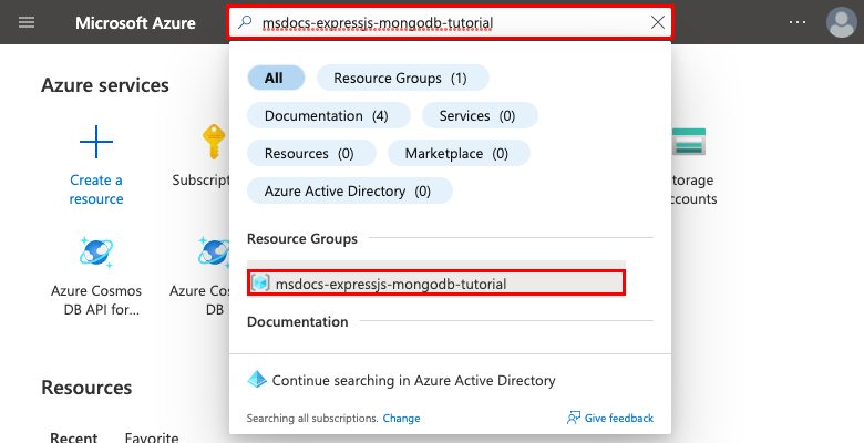 - In Resource Group, select msdocs-expressjs-mongodb-tutorial.
