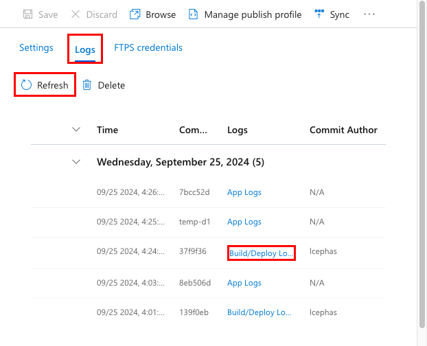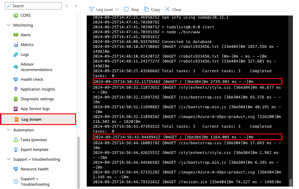 In the AZD output, find the link to stream App Service logs and navigate to it in the browser. The link looks like this in the AZD output: