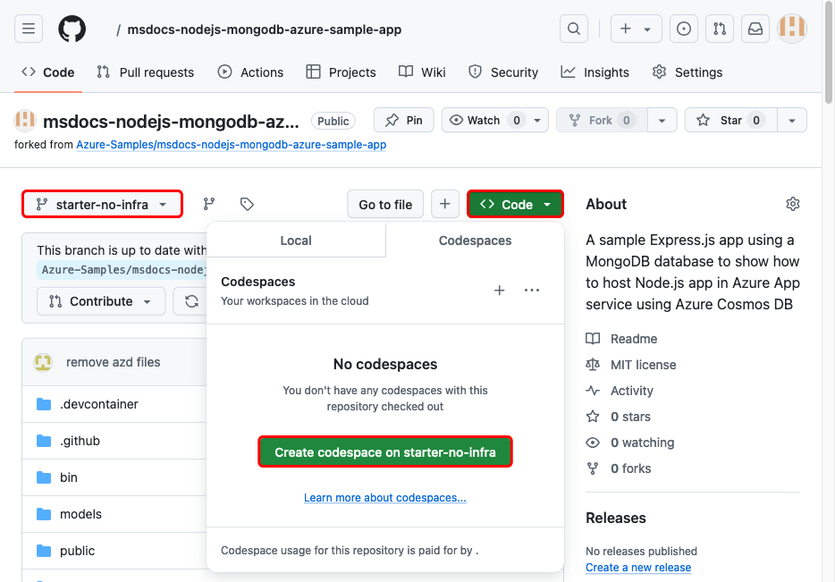 - Navigate to https://github.com/Azure-Samples/msdocs-nodejs-mongodb-azure-sample-app/fork.
