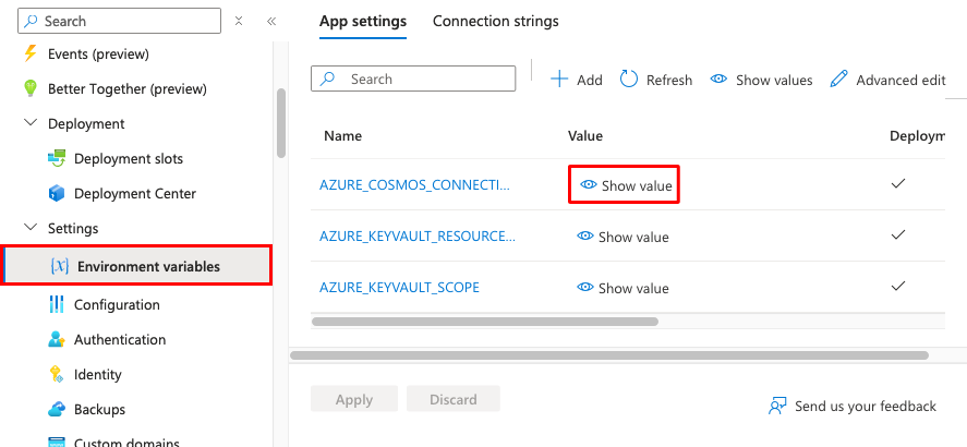 - Next to AZURE_COSMOS_CONNECTIONSTRING, select Show value. This connection string lets you connect to the Cosmos DB database secured behind a private endpoint. However, the secret is saved directly in the App Service app, which isn't the best. You'll change this.