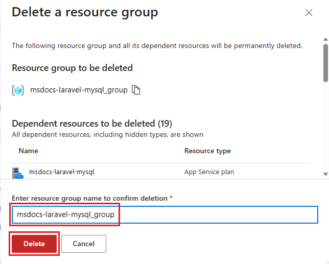 2. In Resource Group, select msdocs-laravel-mysql_group.