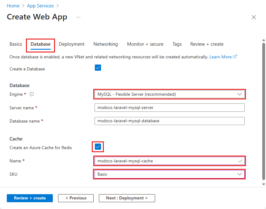 This tutorial shows how to create a secure PHP app in Azure App Service connects to a MySQL database using Azure Database for MySQL Flexible Server. You also deploy an Azure Cache for Redis to enable the caching code in your application. Azure App Service is a highly scalable, self-patching, web-hosting service that can easily deploy apps on Windows or Linux. When you're finished, you have a Laravel app running on Azure App Service on Linux.