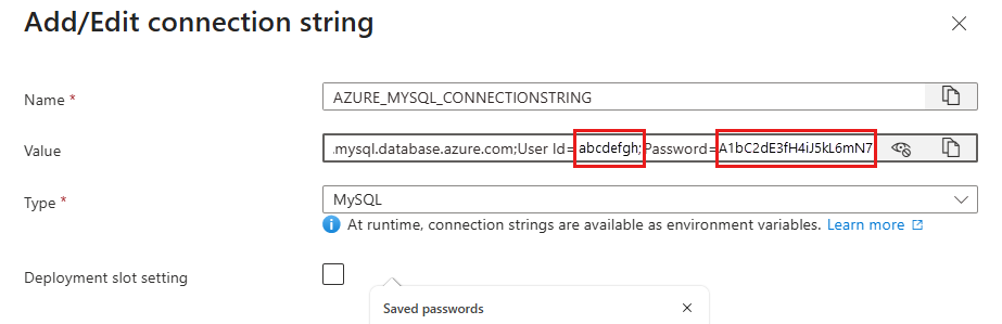 4. In Add/Edit application setting, in the Value field, copy the username and password for use later. The connection string lets you connect to the MySQL database secured behind private endpoints. The secrets are saved directly in the App Service app, which isn't the best. You'll change this configuration.