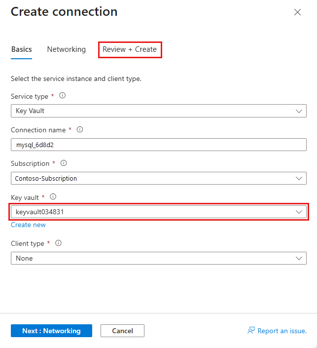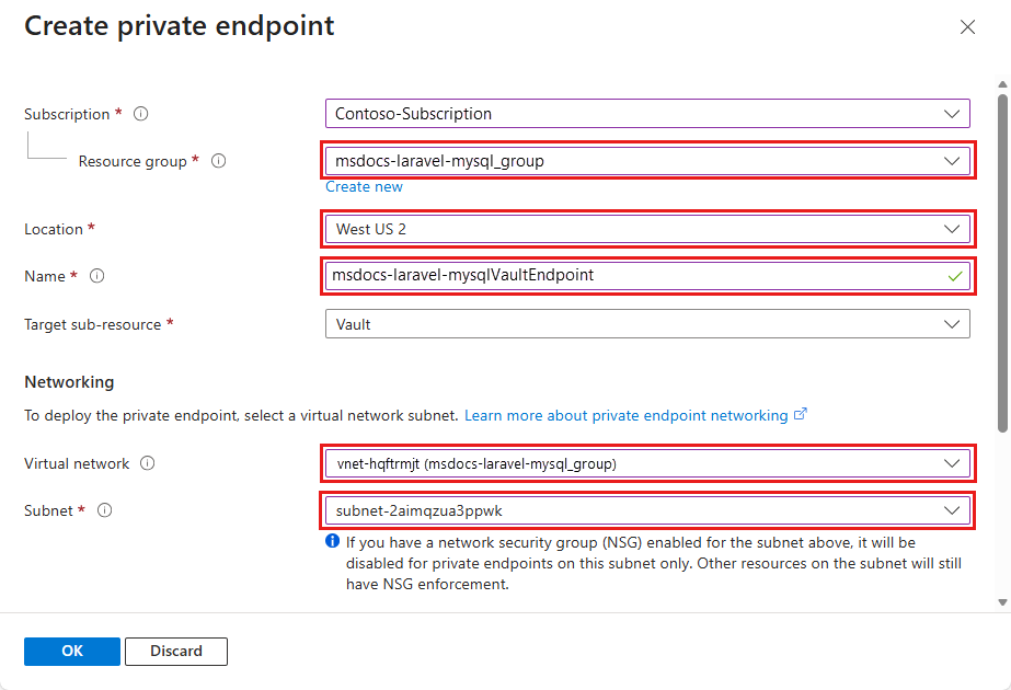6. In Name, enter msdocs-laravel-mysqlVaultEndpoint.