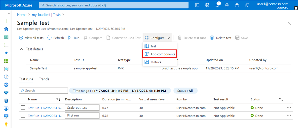 When you update the load test configuration of a load test, all future test runs use the updated configuration. You can also update app components and metrics on the load testing dashboard. In this case, the configuration changes only apply to the current test run.