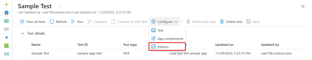 1. On the test details page, select Configure, and then select Metrics to select the specific resource metrics to capture during the load test.