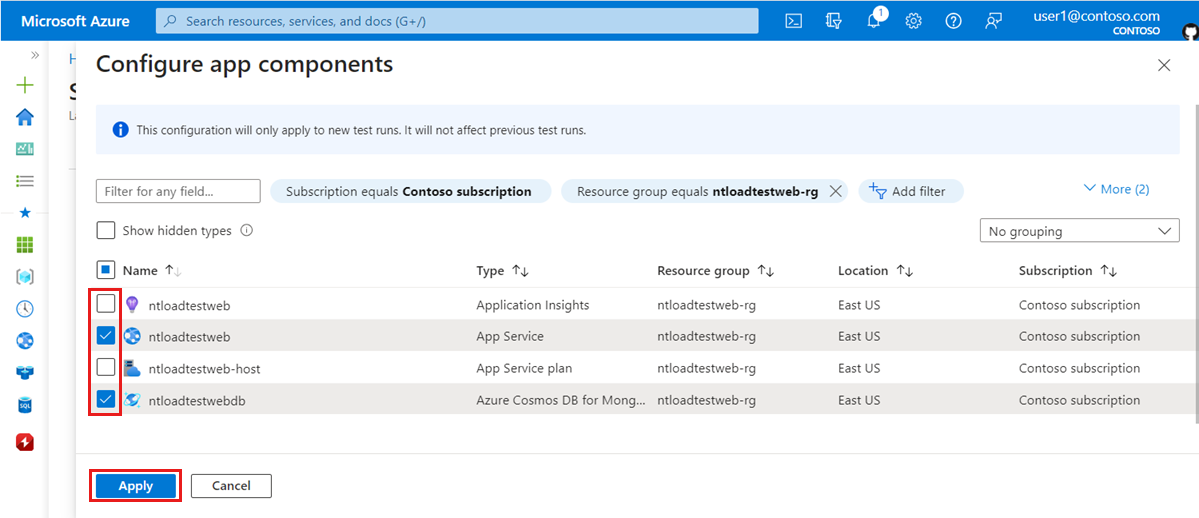 4. On the Configure App Components page, select or clear the checkboxes for the Azure resources you want to add or remove, and then select Apply.