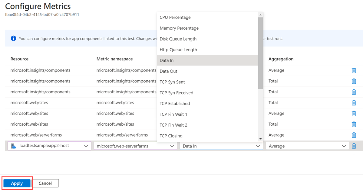 When you add app components to your load test configuration, Azure Load Testing adds the most relevant resource metrics for these components. You can add or remove resource metrics for each of the app components in your load test.
