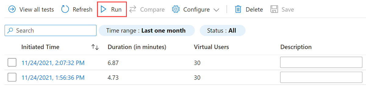 Screenshot that shows the 'Run' button for running the load test from the test details page.