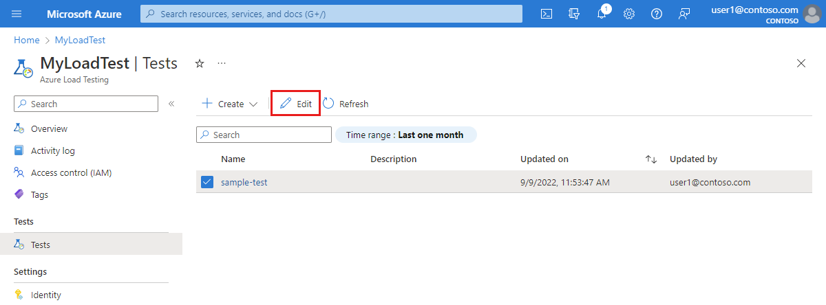 Select your test from the list, and then select Edit to edit the load test configuration.