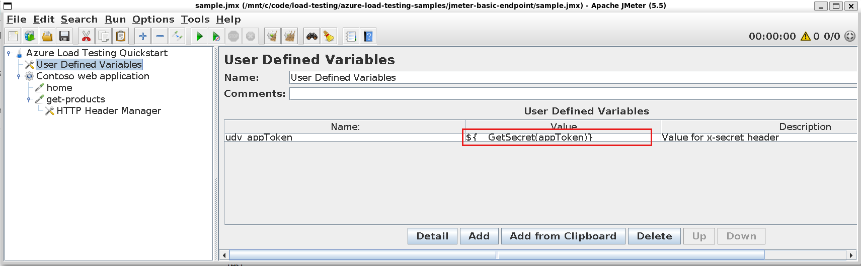 GetSecretfunction abstracts retrieving the value from either Azure Key Vault or the CI/CD secrets store.Update the JMeter sampler component to pass the secret in the request.