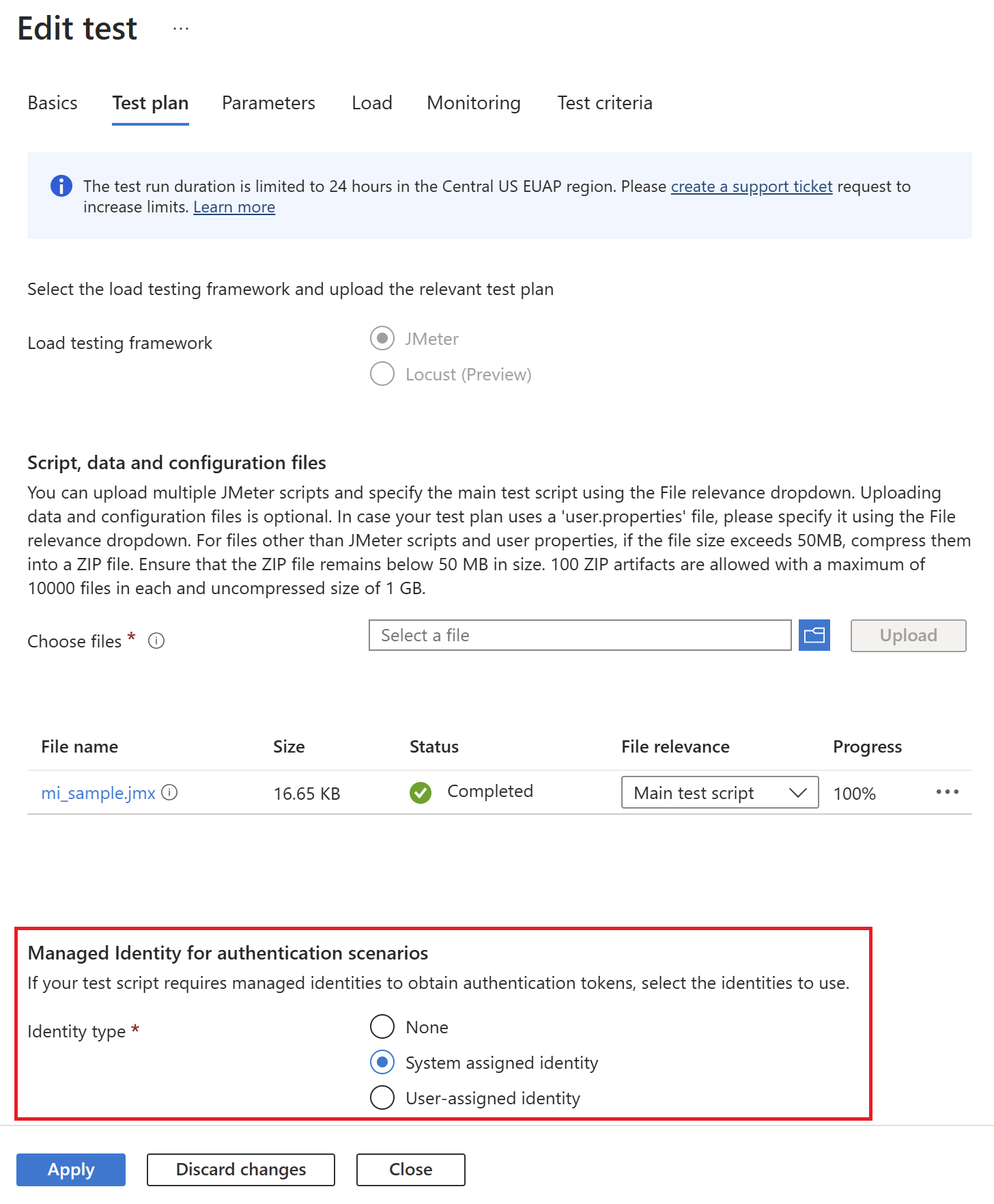 On the Test plan tab, configure the Managed identity for authentication scenarios. Select 'System-assigned identity' or 'User-assigned identity' as required.