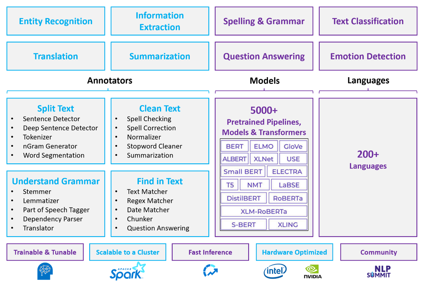 Spark NLP delivers highly accurate results across an expanding array of natural language processing tasks. The library comes with prebuilt deep learning models for named entity recognition, document classification, and sentiment detection. Its feature-rich design includes pretrained language models that support word, chunk, sentence, and document embeddings.