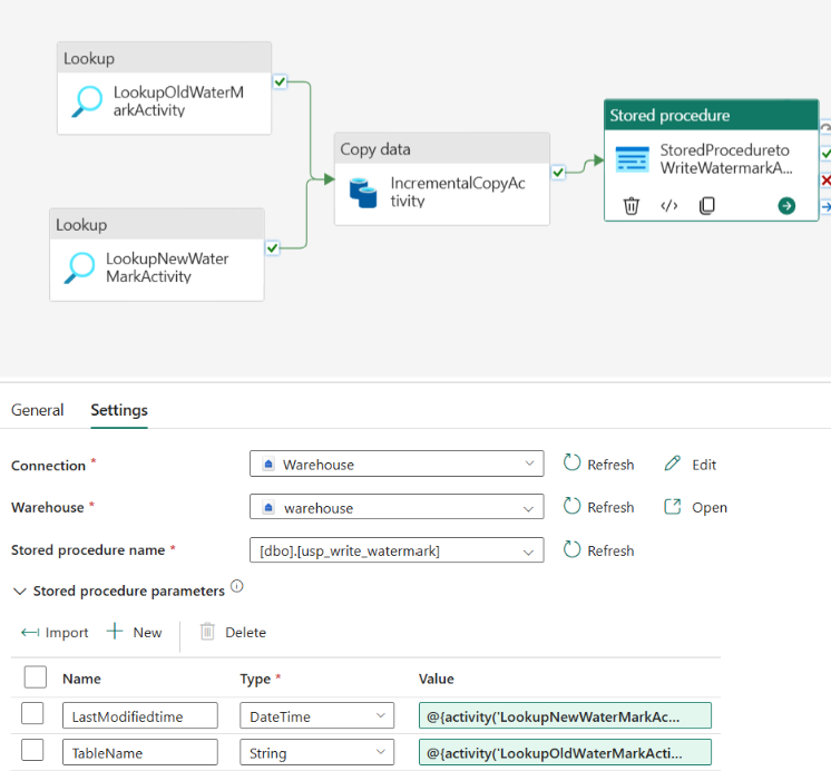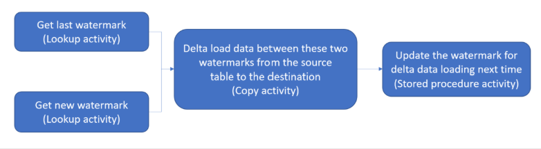 • A stored procedure activity that saves the new watermark value to determine the starting point for the next pipeline run.