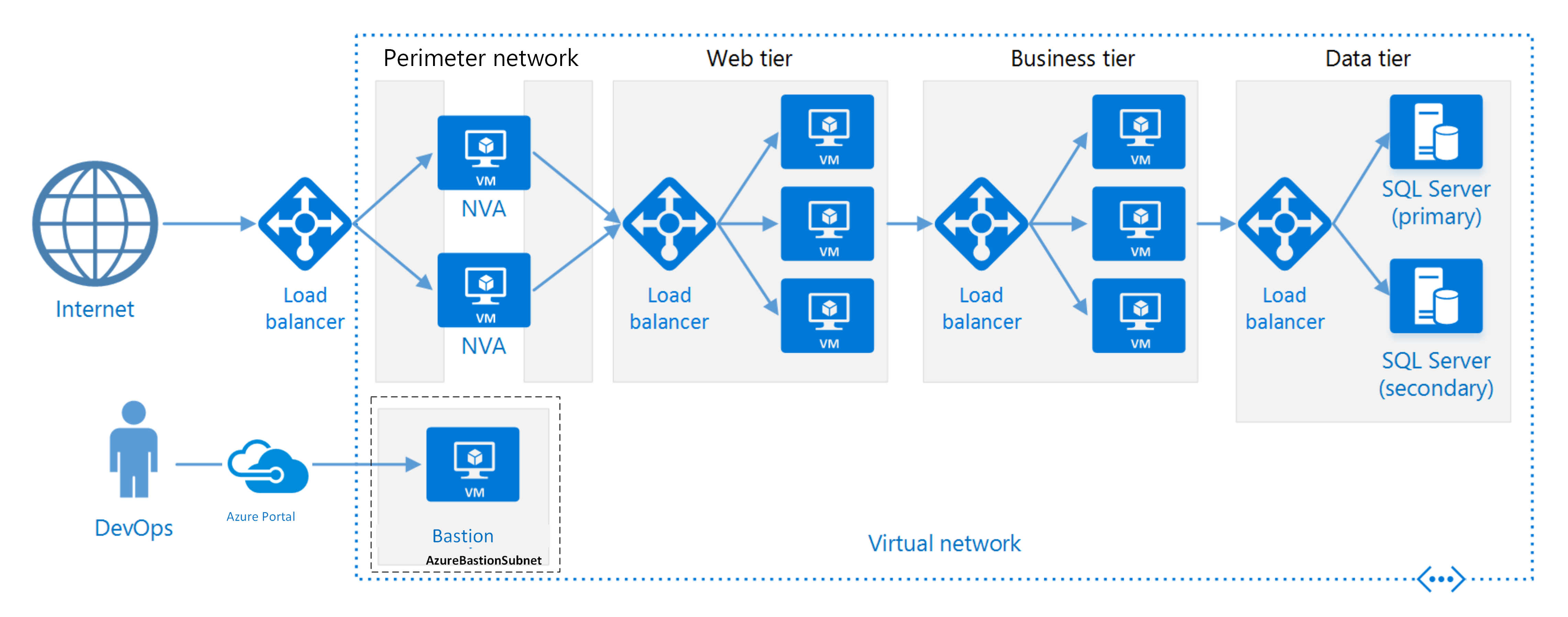 Network security groups restrict access to each tier. For example, the database tier only allows access from the business tier.
