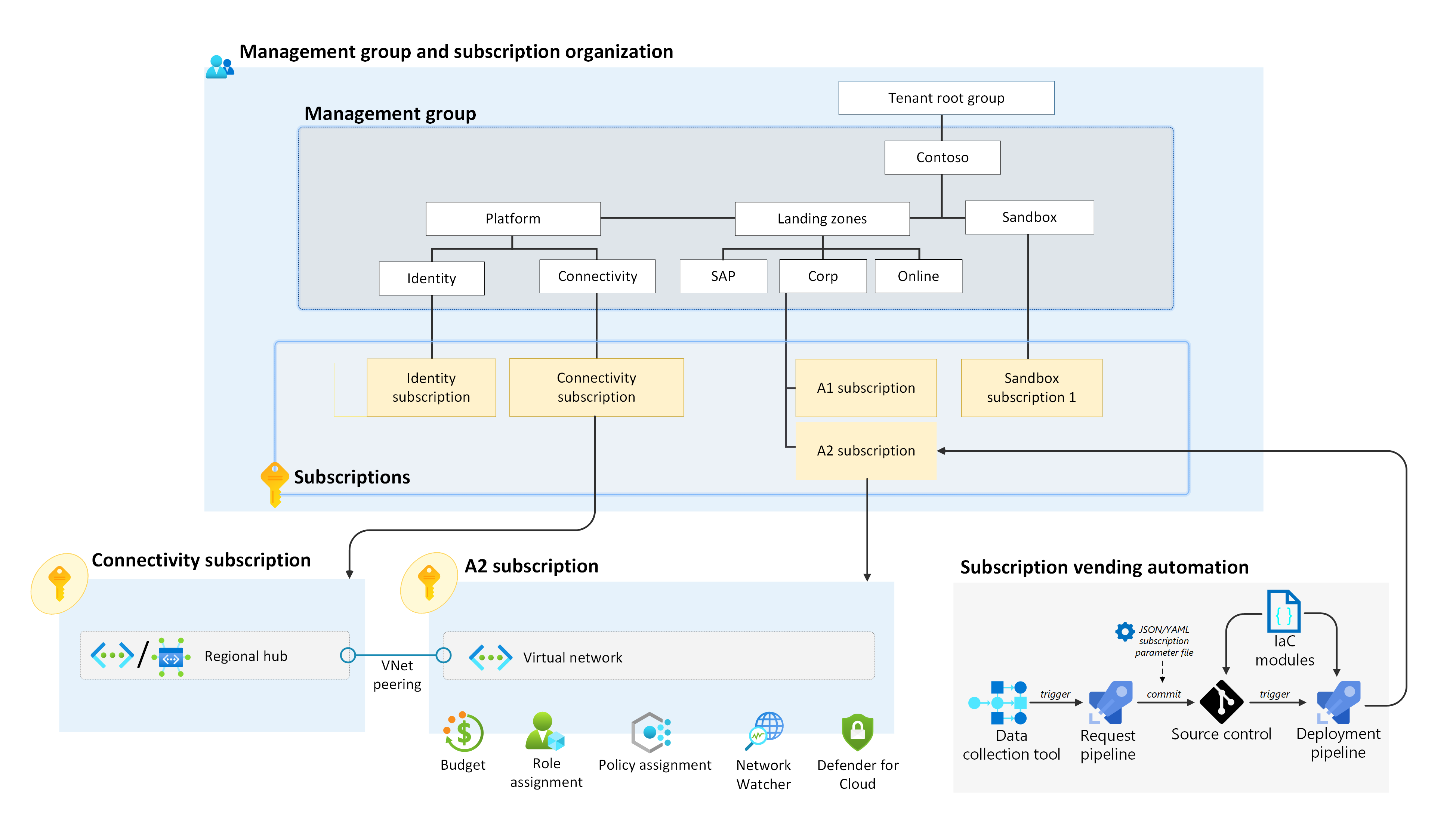 | Governance | • Place in management group hierarchy. • Assign subscription owner. • Configure subscription-level Azure role-based access control (Azure RBAC) to the correct security groups. • Assign subscription-level Azure Policy. • Configure the Microsoft Defender for Cloud enrollment. |