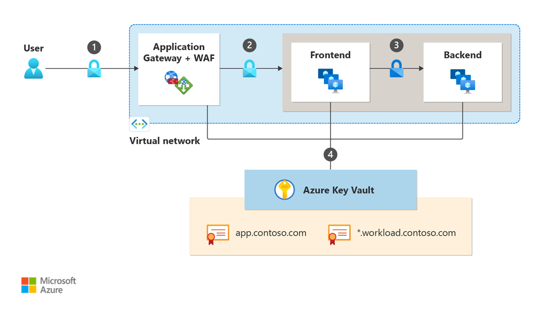 The back-end VM decrypts the request using the internal certificate. After the back end processes the request, it returns the result to the front end, which returns the result to the application gateway, and it finally returns the result to the user.