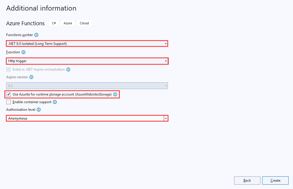 Functions worker Select .NET 8.0 Isolated (Long Term Support). Visual Studio creates a function project that runs in an isolated worker process. The isolated worker process also supports other versions of .NET and .NET Framework that don't offer long term support (LTS). For more information, see Azure Functions runtime versions overview.