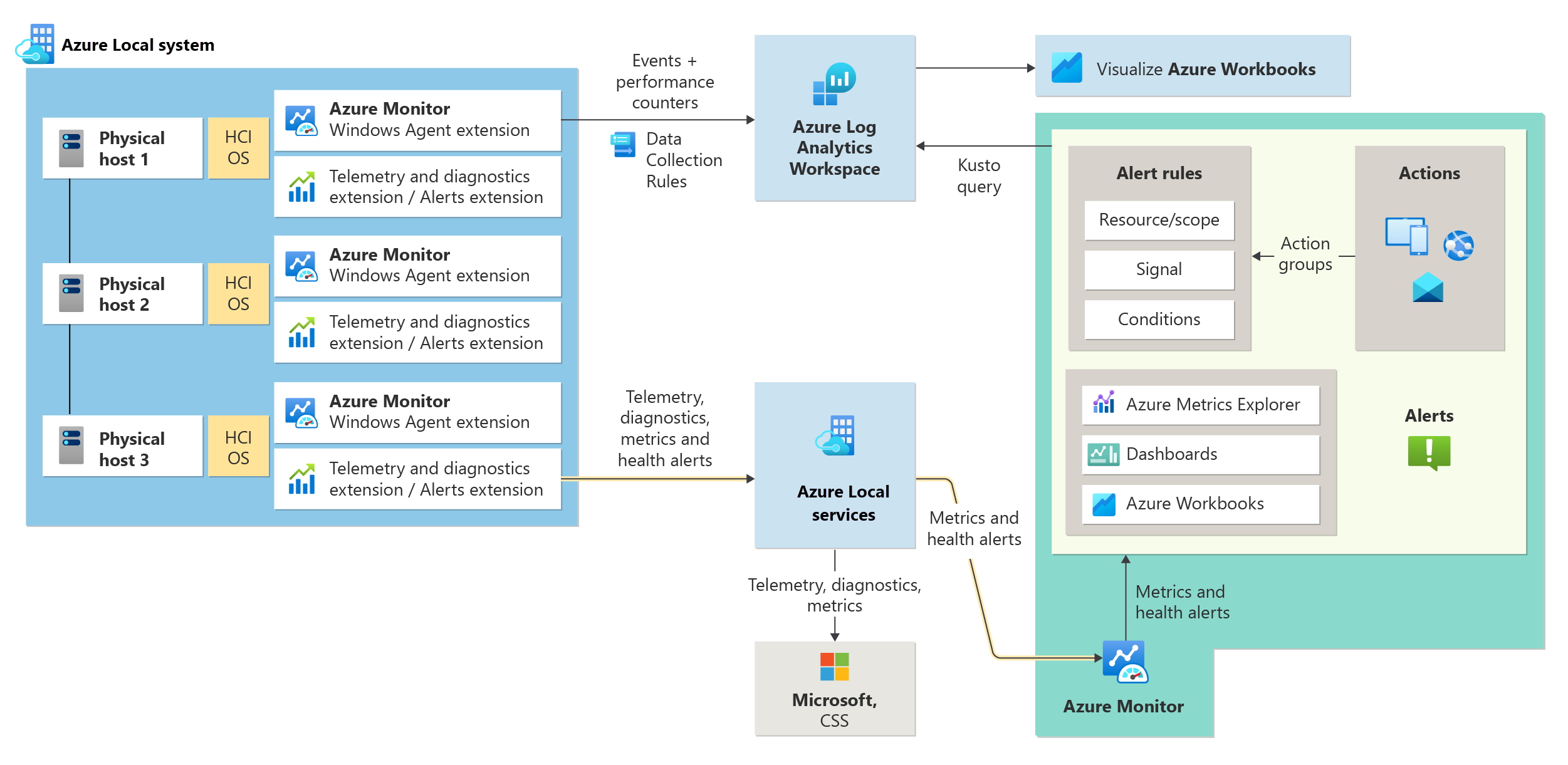 Azure Local utilizes Azure Monitor tools, such as Insights, Metrics, Logs, Workbooks, and Alerts. These tools help collect data, analyze, and proactively respond to consistent or trending variances from your established baseline.