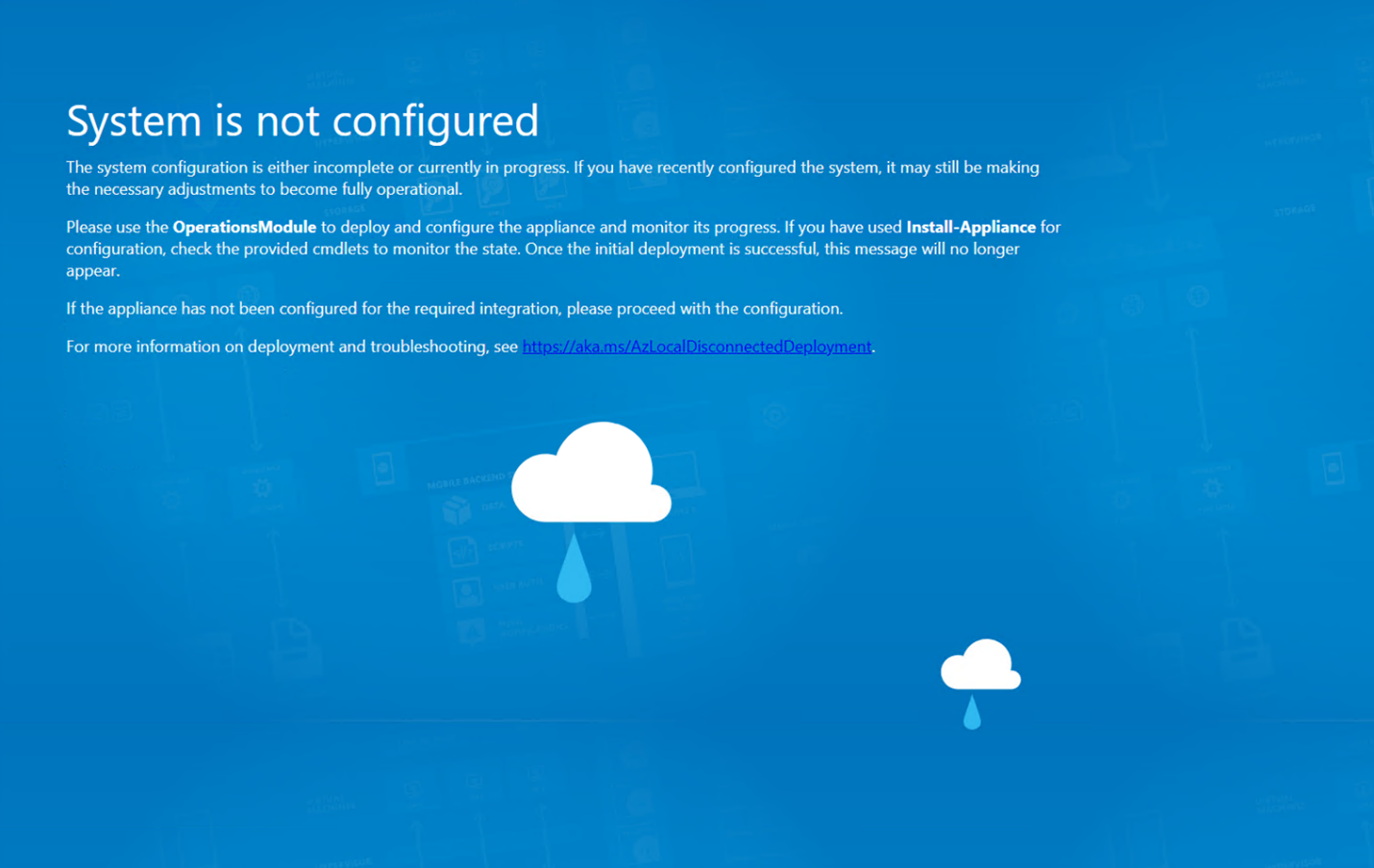 After you install the appliance, you might see this screen for a while. Let the configuration run for 2-3 hours. After you wait 2-3 hours, the screen goes away, and you see the regular Azure portal. If the screen doesn't go away and you can't access the local Azure portal, troubleshoot the issue.