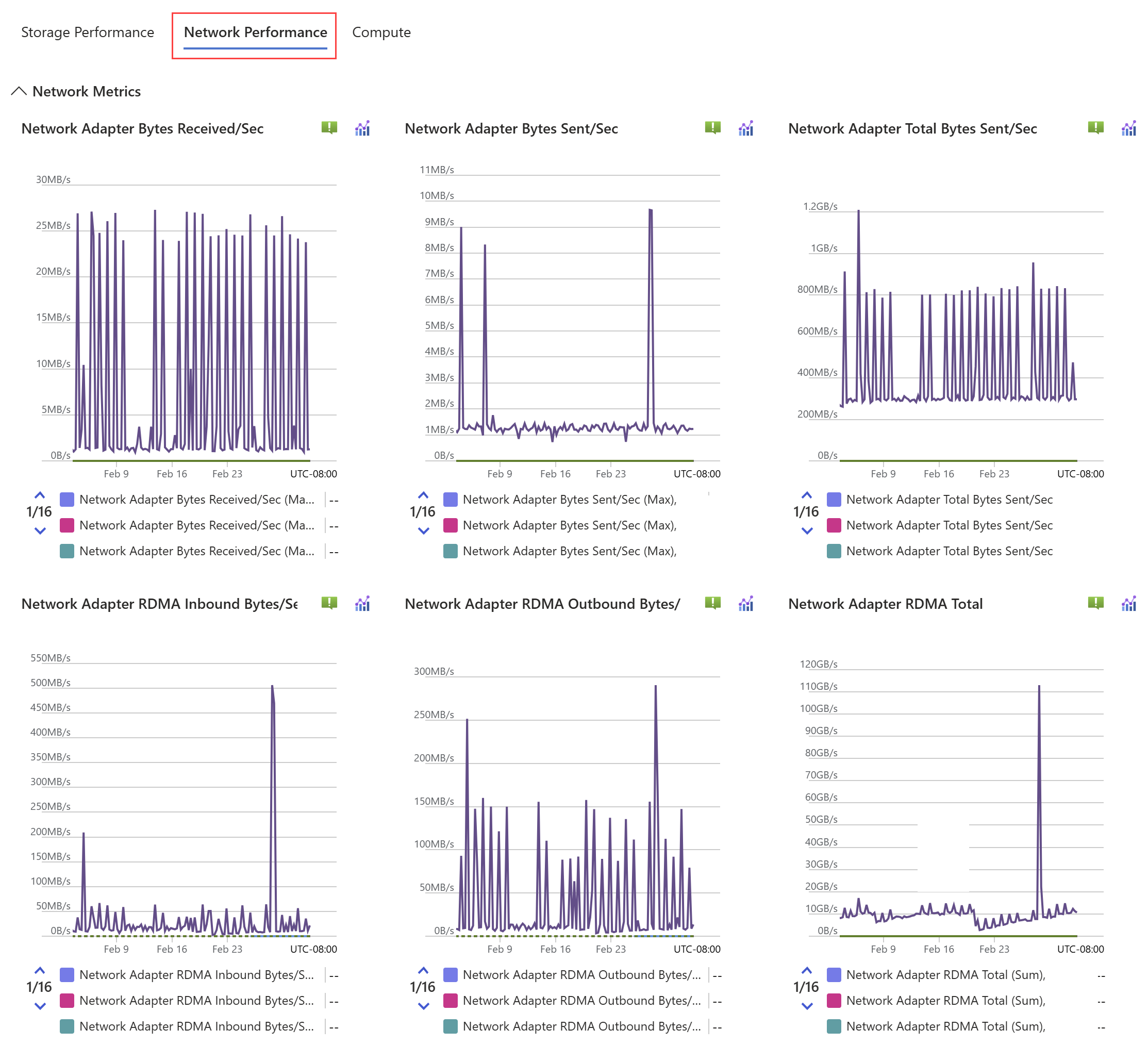 | Network In/Sec | Rate of data received by the network adapter. | Bytes Per Second | Maximum | Minimum, Maximum, Average, Sum, Count | Cluster, Node, Network Adapter, LUN |