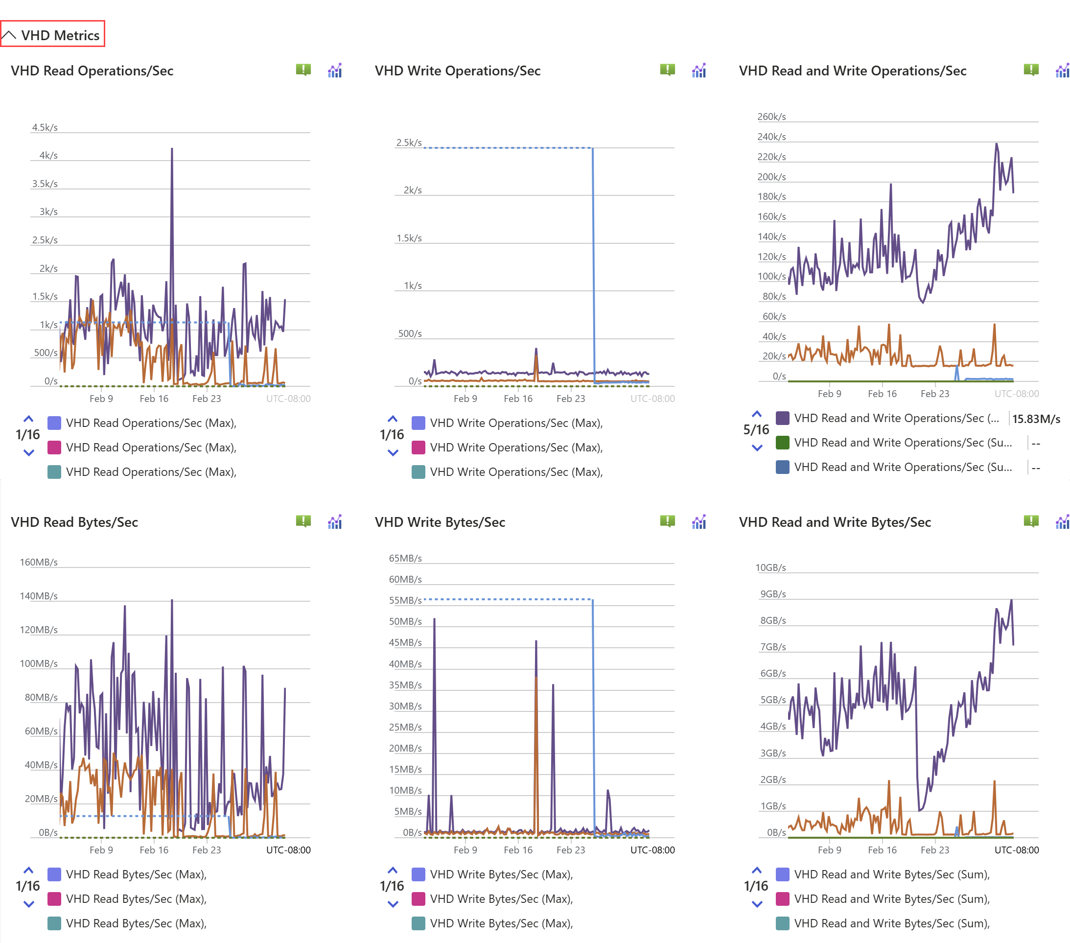 | VHD Read Operations/Sec | Number of read operations per second completed by the virtual hard disk. | Count Per Second | Maximum | Minimum, Maximum, Average, Sum, Count | Cluster, Node, VHD |