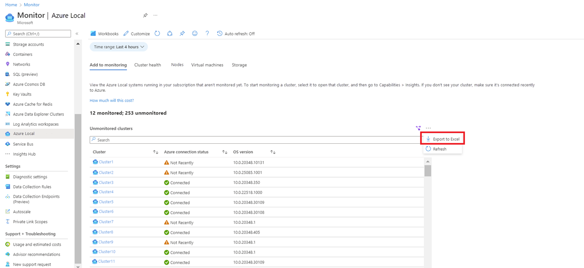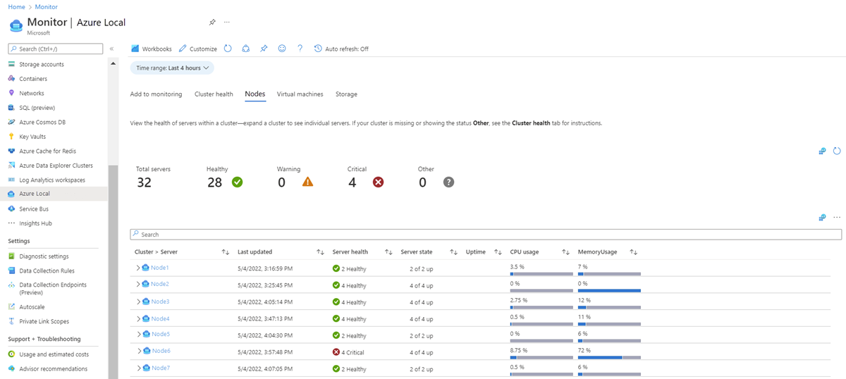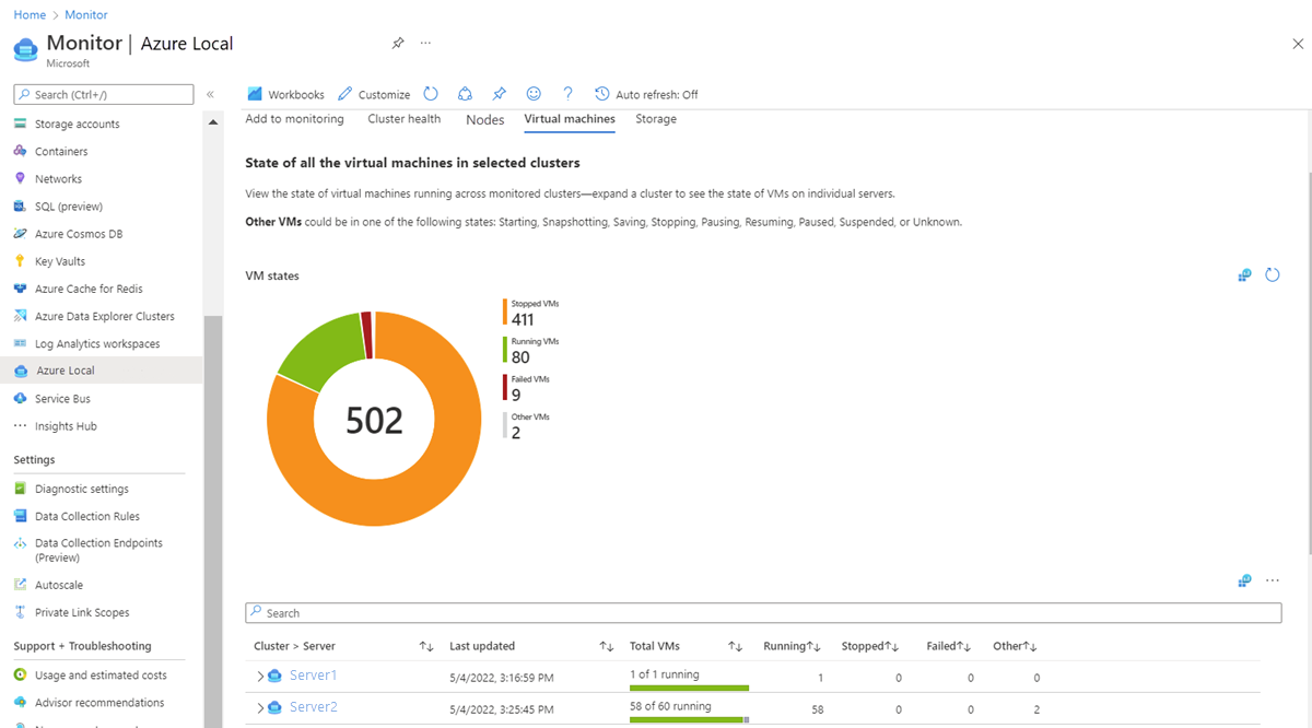 You can access Insights from Azure Monitor > Insights > Azure Local. Use the following tabs to toggle between views: Add to monitoring, Cluster healthNodes, Virtual machines, and Storage.