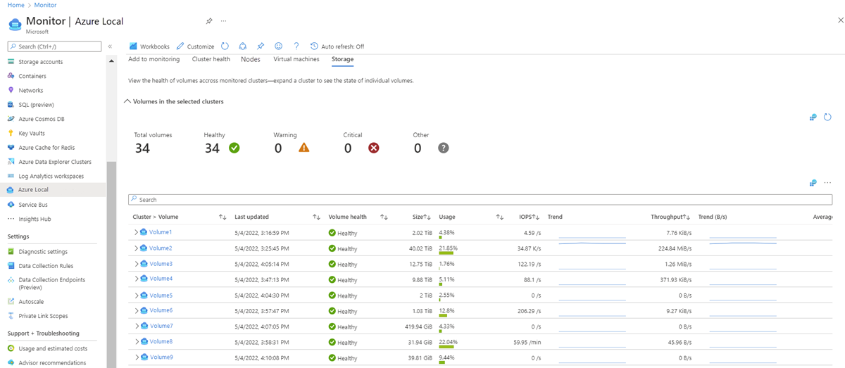This view shows the health of volumes, usage, and performance across monitored clusters. Expand a cluster to see the state of individual volumes. This view is built using the volume event ID 3002 of the Microsoft-Windows-SDDC-Management/Operational Windows Event Log Channel. The tiles on the top provide an overview of the health of storage.
