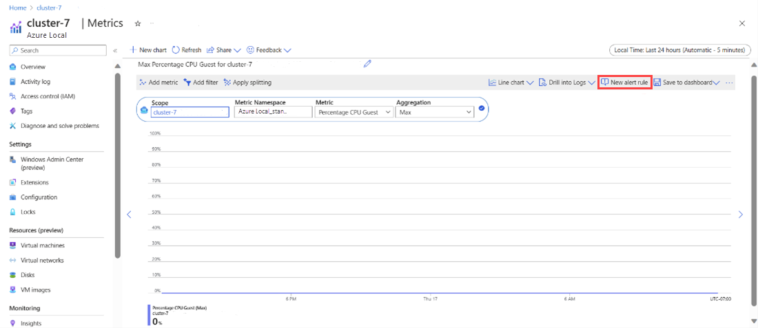 You can create metric alerts for Azure Local through metrics explorer in the Azure portal or command-Line Interface (CLI).