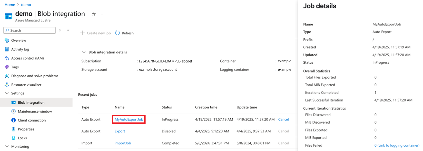 The Blob Integration pane displays details of export activities in the Recent jobs section, including the status of recent jobs and metrics related to automatic synchronization.