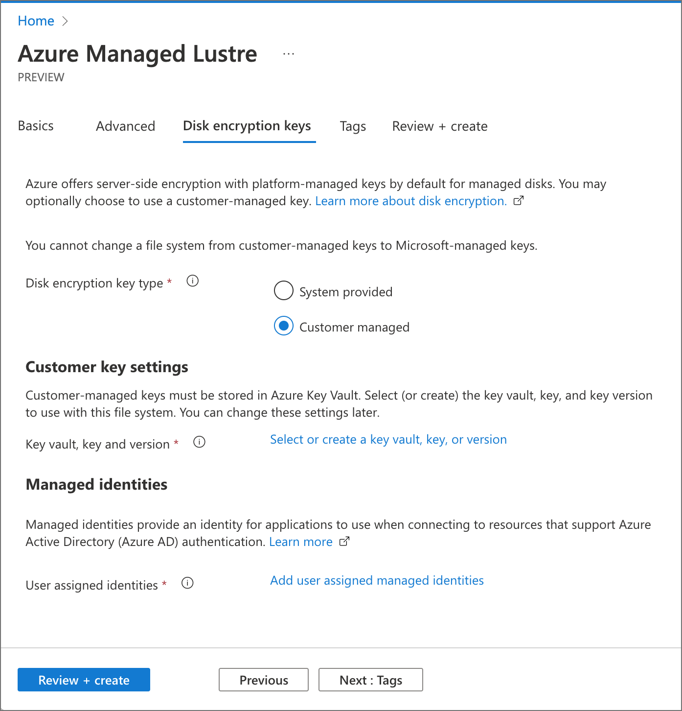 When you create your Managed Lustre file system, on the Disk encryption keys tab under Disk encryption key type, select Customer managed. Then, other settings appear under Customer Key settings and Managed identities.
