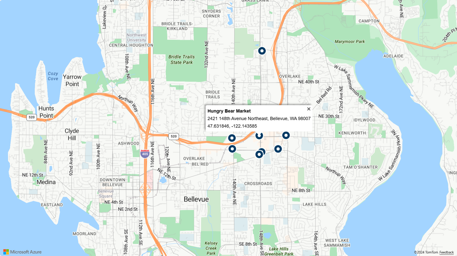 readyevent handler after the code to create an instance of a Popup and add a mouseover event to the symbol layer. This code shows a popup window with the results when you mouse over a point of interest.function showPopup(e) { //Get the properties and coordinates of the first shape that the event occurred on. var p = e.shapes[0].getProperties(); var position = e.shapes[0].getCoordinates(); //Create HTML from properties of the selected result. var html = ` <div style="padding:5px"> <div><b>${p.poi.name}</b></div> <div>${p.address.freeformAddress}</div> <div>${position[1]}, ${position[0]}</div> </div>`; //Update the content and position of the popup. popup.setPopupOptions({ content: html, position: position }); //Open the popup. popup.open(map); }Save the file and refresh your browser. Now the map in the browser shows information popups when you hover over any of the search pins.