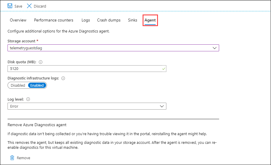 On the Agent tab, you can change the storage account, set the disk quota, and specify whether to collect diagnostic infrastructure logs.