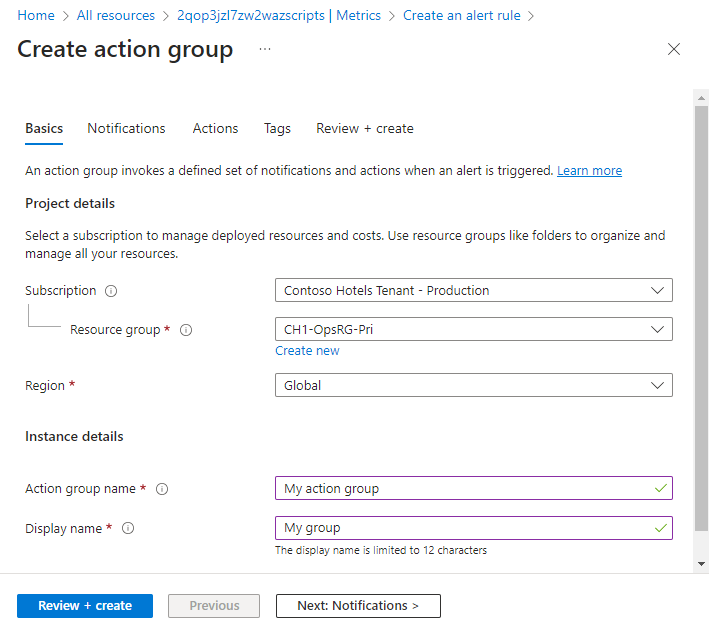 Select a Subscription and Resource group for the action group and give it an Action group name that will appear in the portal and a Display name that will appear in email and SMS notifications.