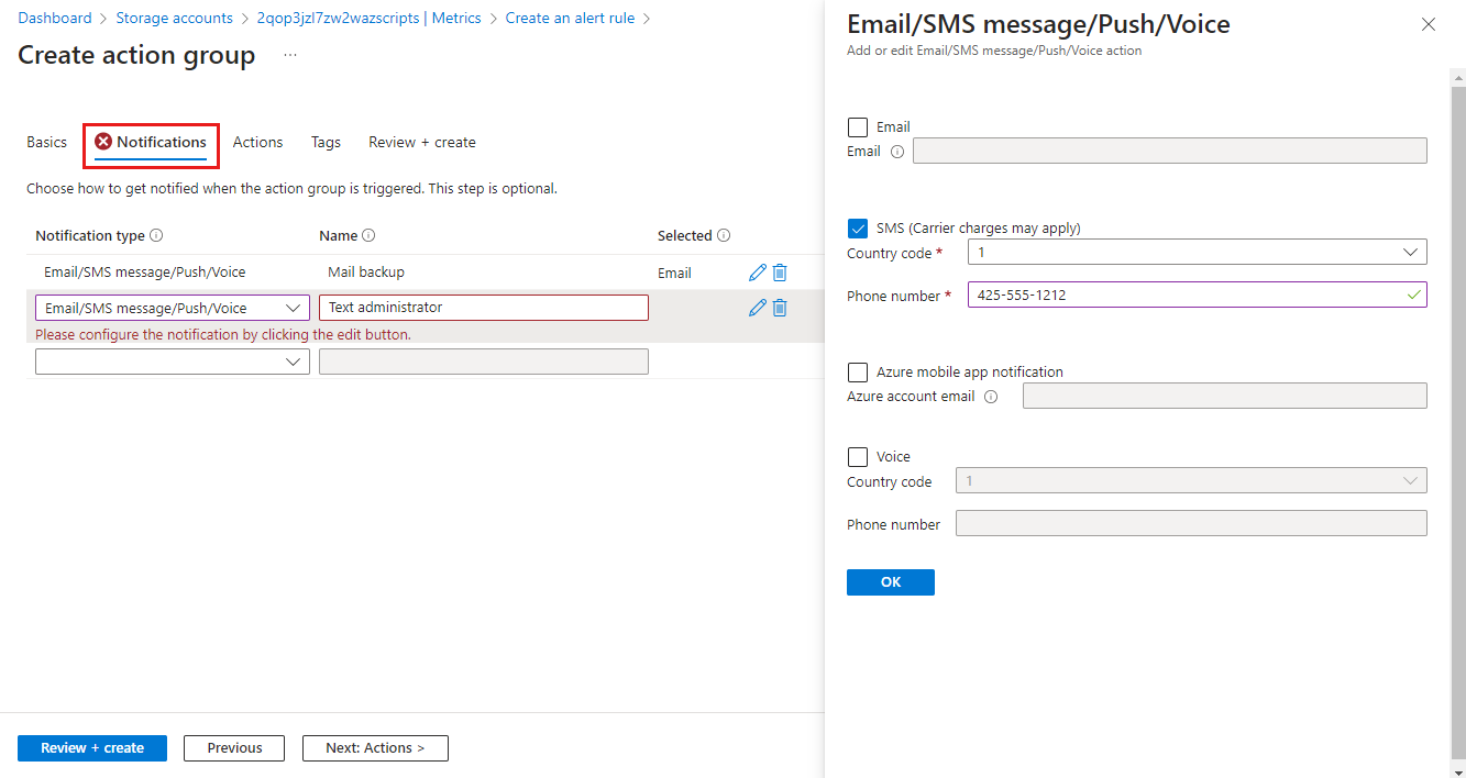 Select the Notifications tab and add one or more methods to notify appropriate people when the alert is fired.