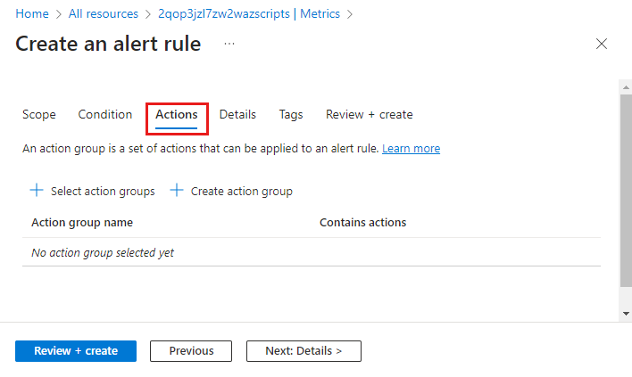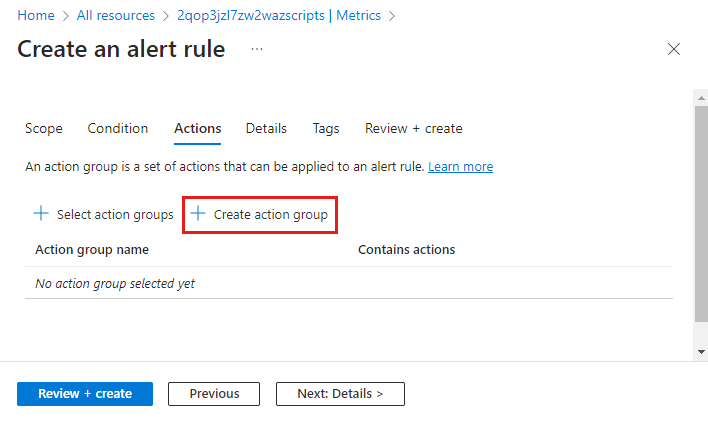 If you don't already have an action group in your subscription to select, then click Create action group to create a new one.