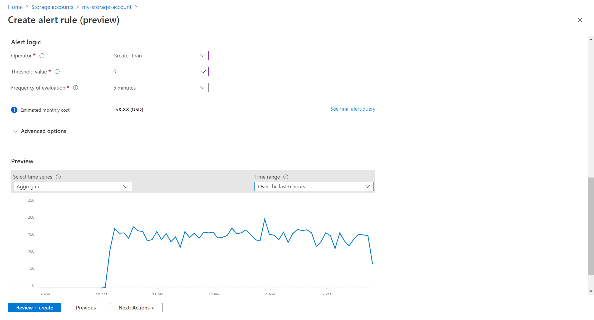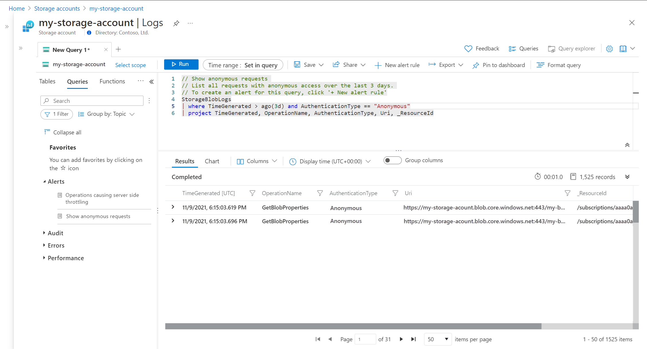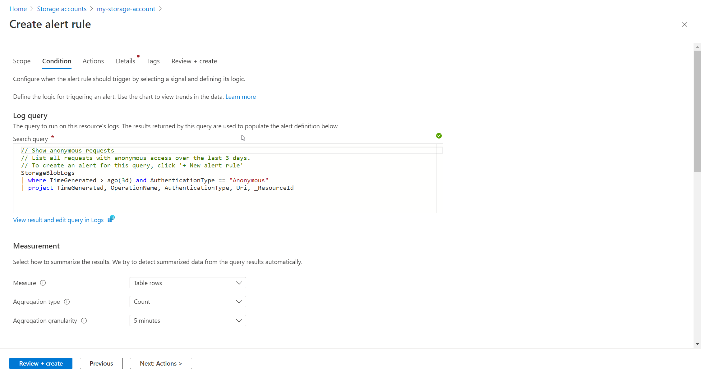 For example, if the measurement is Table rows, the alert logic may be Greater than 0 indicating that at least one record was returned. If the measurement is a columns value, then the logic may need to be greater than or less than a particular threshold value. In the following example, the log query is looking for anonymous requests to a storage account. If an anonymous request is made, then we should trigger an alert. In this case, a single row returned would trigger the alert, so the alert logic should be Greater than 0.