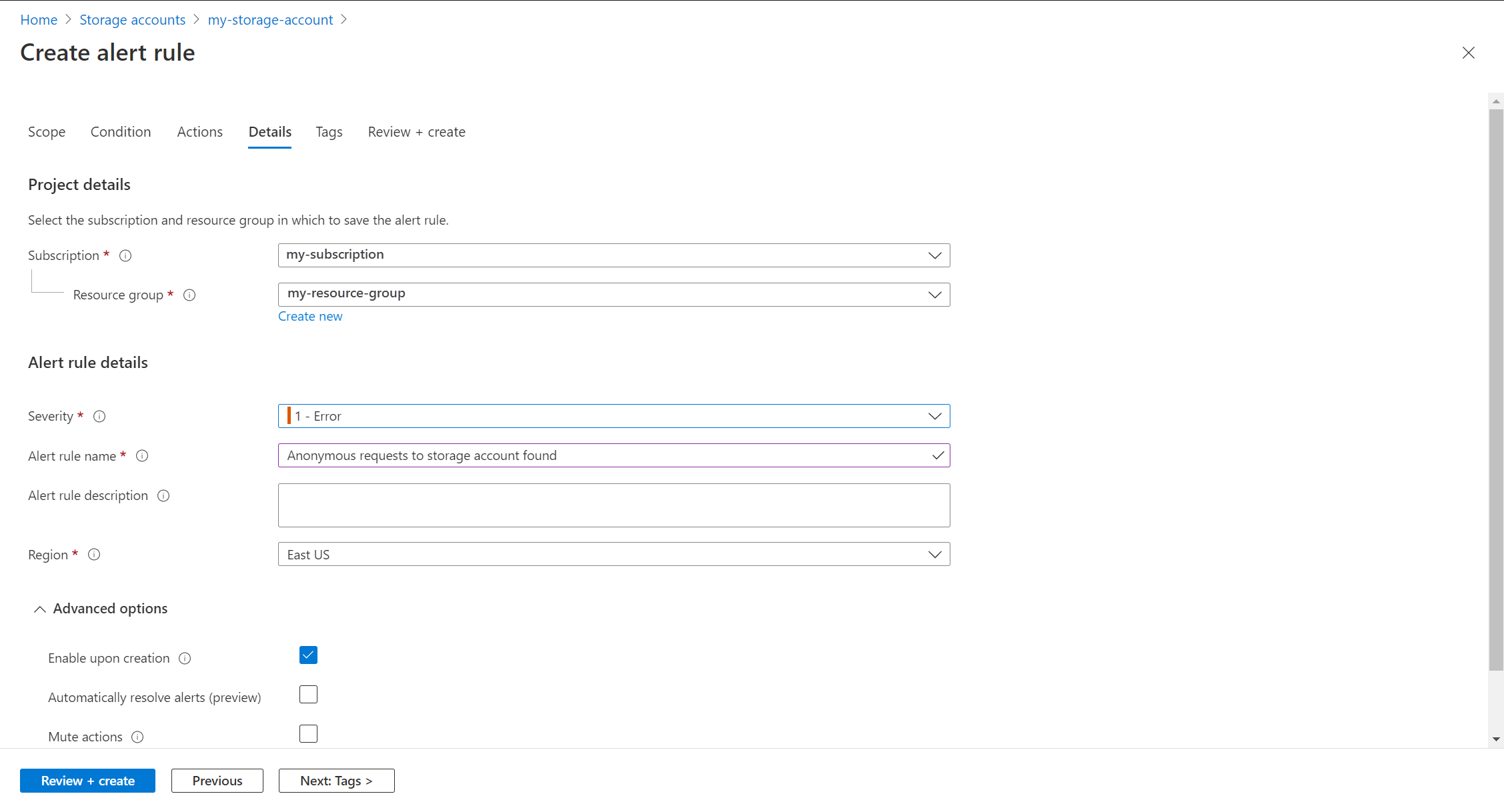 - Under Advanced options, keep the box checked to Enable upon creation.