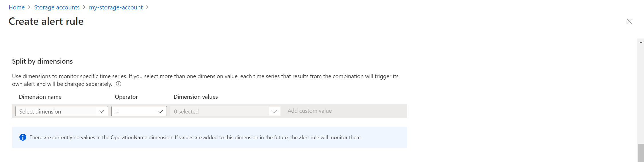 Split by dimensions allows you to create separate alerts for different resources. This setting is useful when you're creating an alert rule that applies to multiple resources. With the scope set to a single resource, this setting typically isn't used.