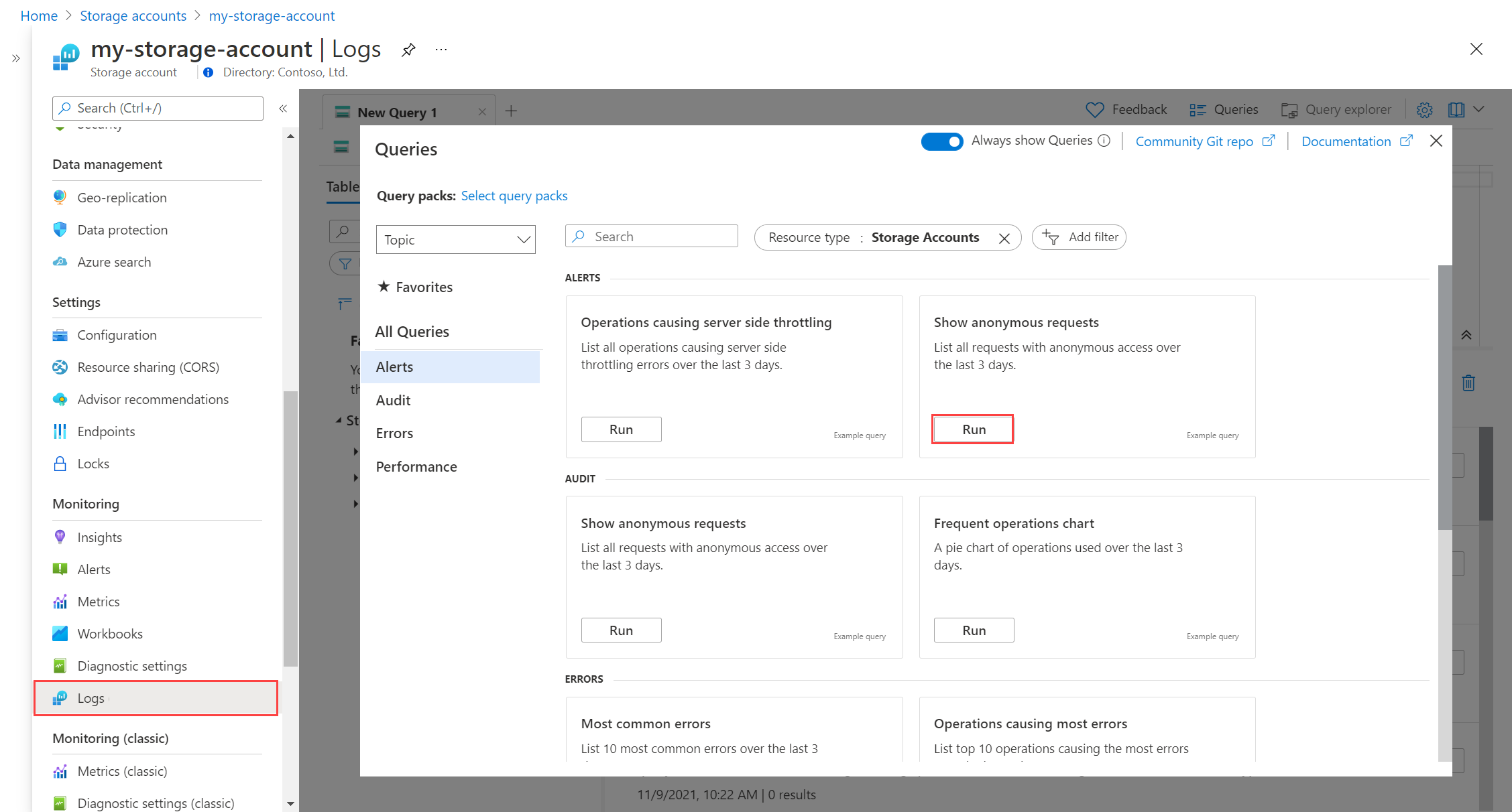 Select Logs from your resource's menu. Log Analytics opens with the Queries window that includes prebuilt queries for your Resource type. Select Alerts to view queries designed for alert rules.