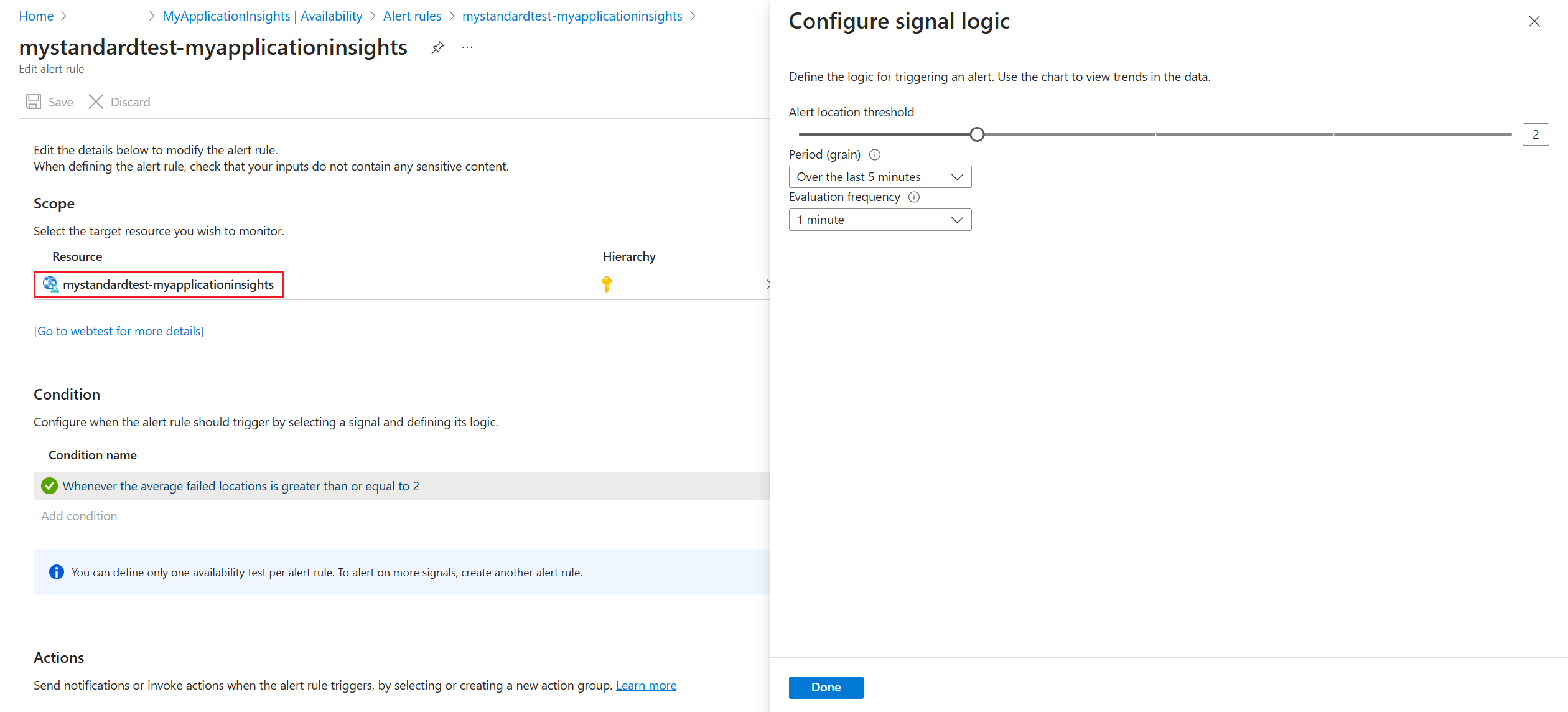 • Alert on X out of Y locations reporting failures: The X out of Y locations alert rule is enabled by default in the new unified alerts experience when you create a new availability test. You can opt out by selecting the "classic" option or by choosing to disable the alert rule. Configure the action groups to receive notifications when the alert triggers by following the preceding steps. Without this step, you only receive in-portal notifications when the rule triggers.