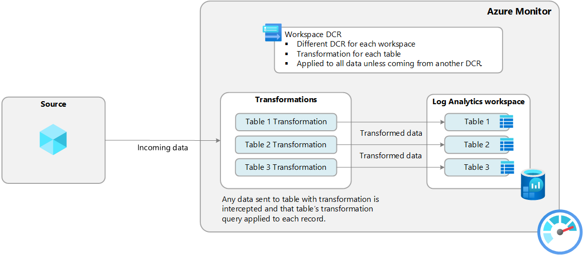 There can be only one workspace DCR for each workspace, but it can include transformations for any number of supported tables. These transformations are applied to any data sent to these tables unless that data came from another DCR.