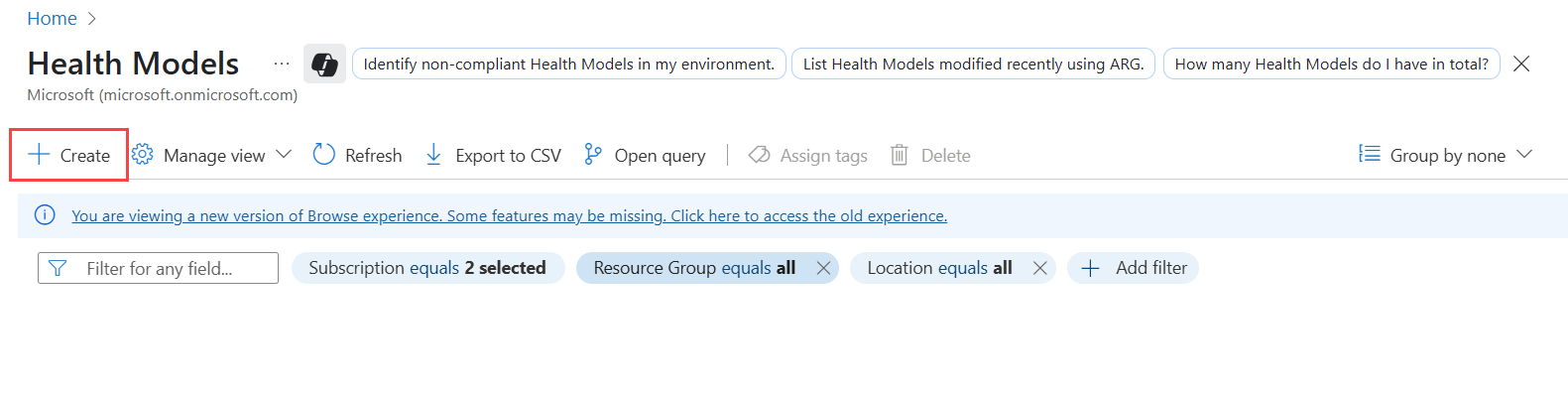 - You must have at least Contributor role on the resource group or inherited from the subscription where you want to create the health model. If you create a new resource group for the health model, then you must have the Contributor role on the subscription.