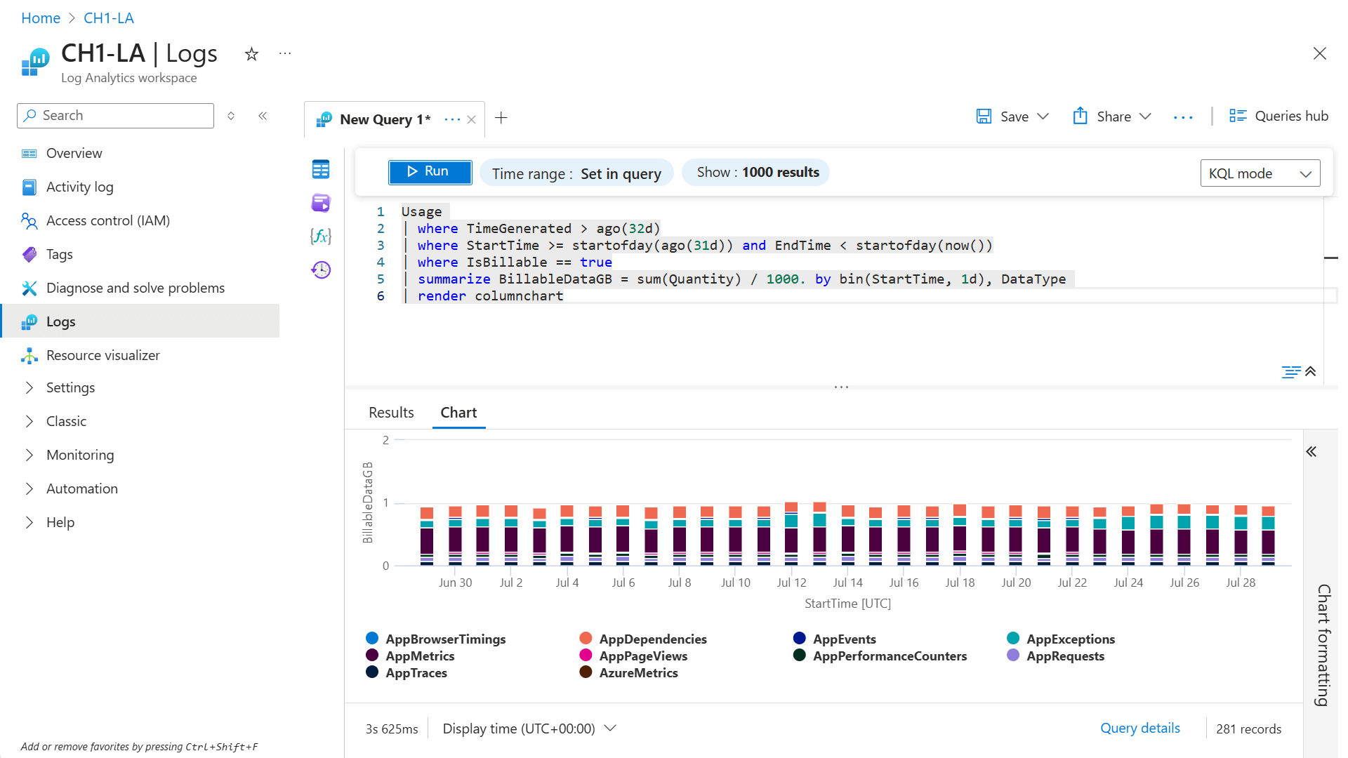 For workspaces with large data volumes, doing queries such as the ones shown in this section, which query large volumes of raw data, might need to be restricted to a single day. To track trends over time, consider setting up a Power BI report and using incremental refresh to collect data volumes per resource once a day.
