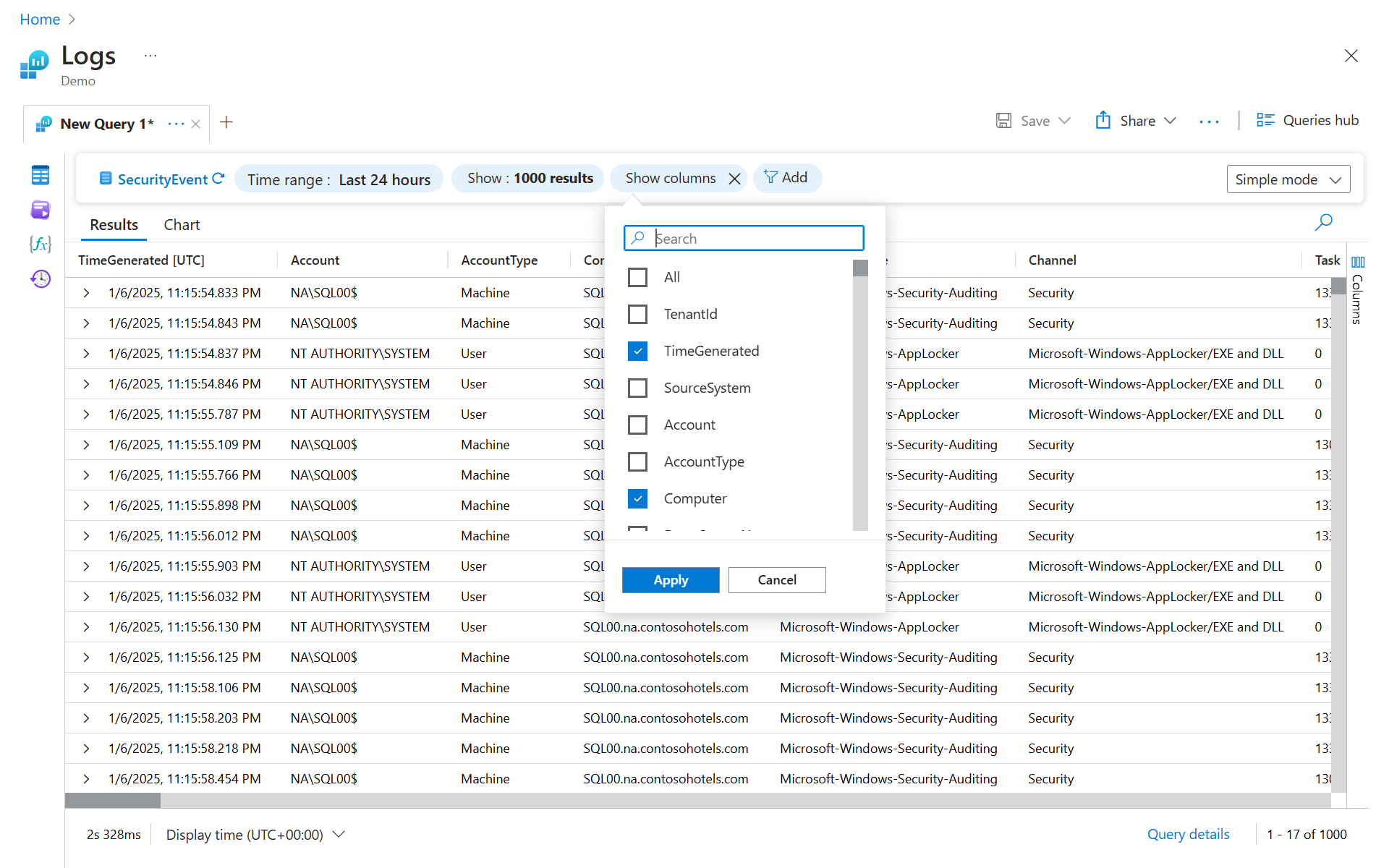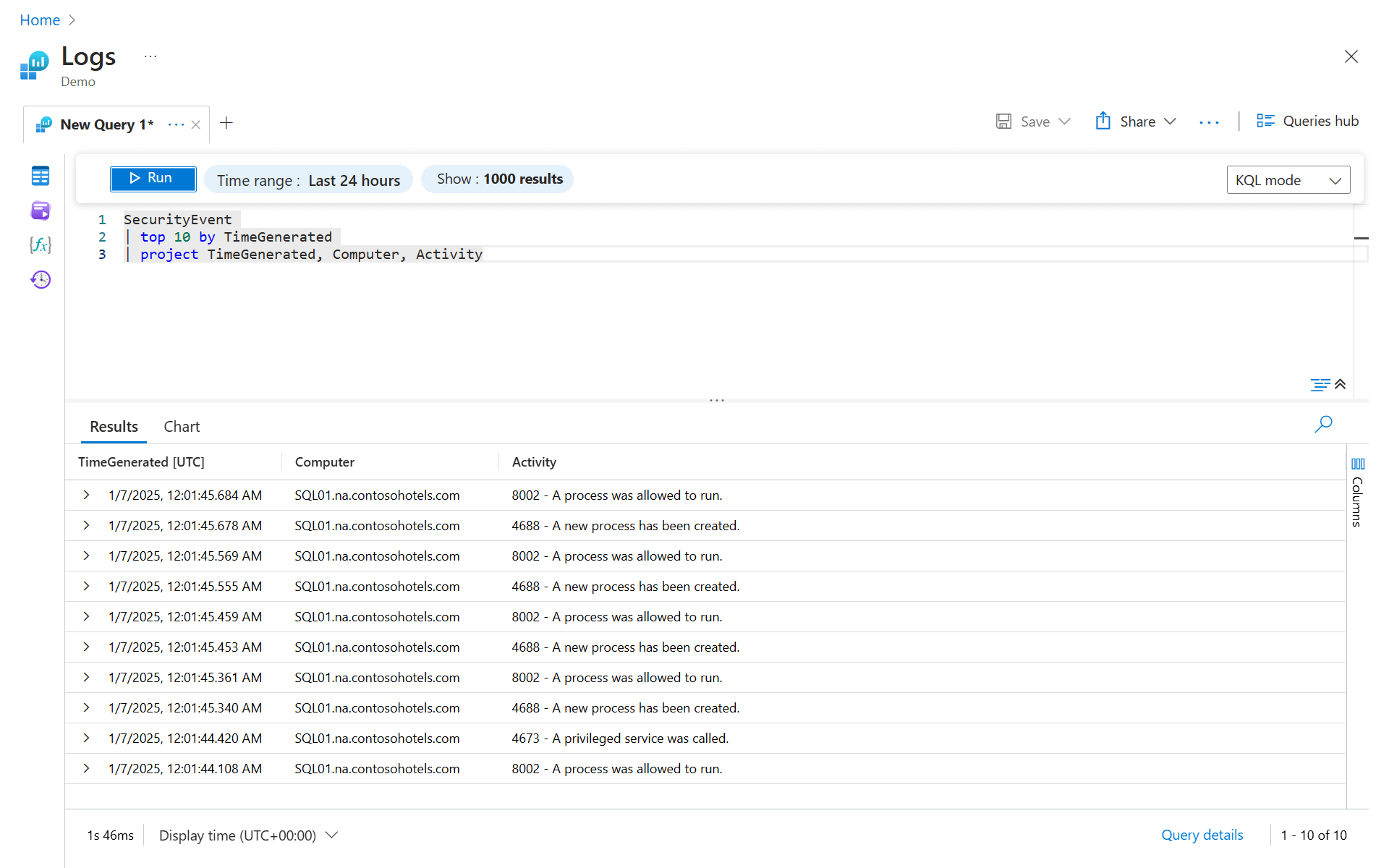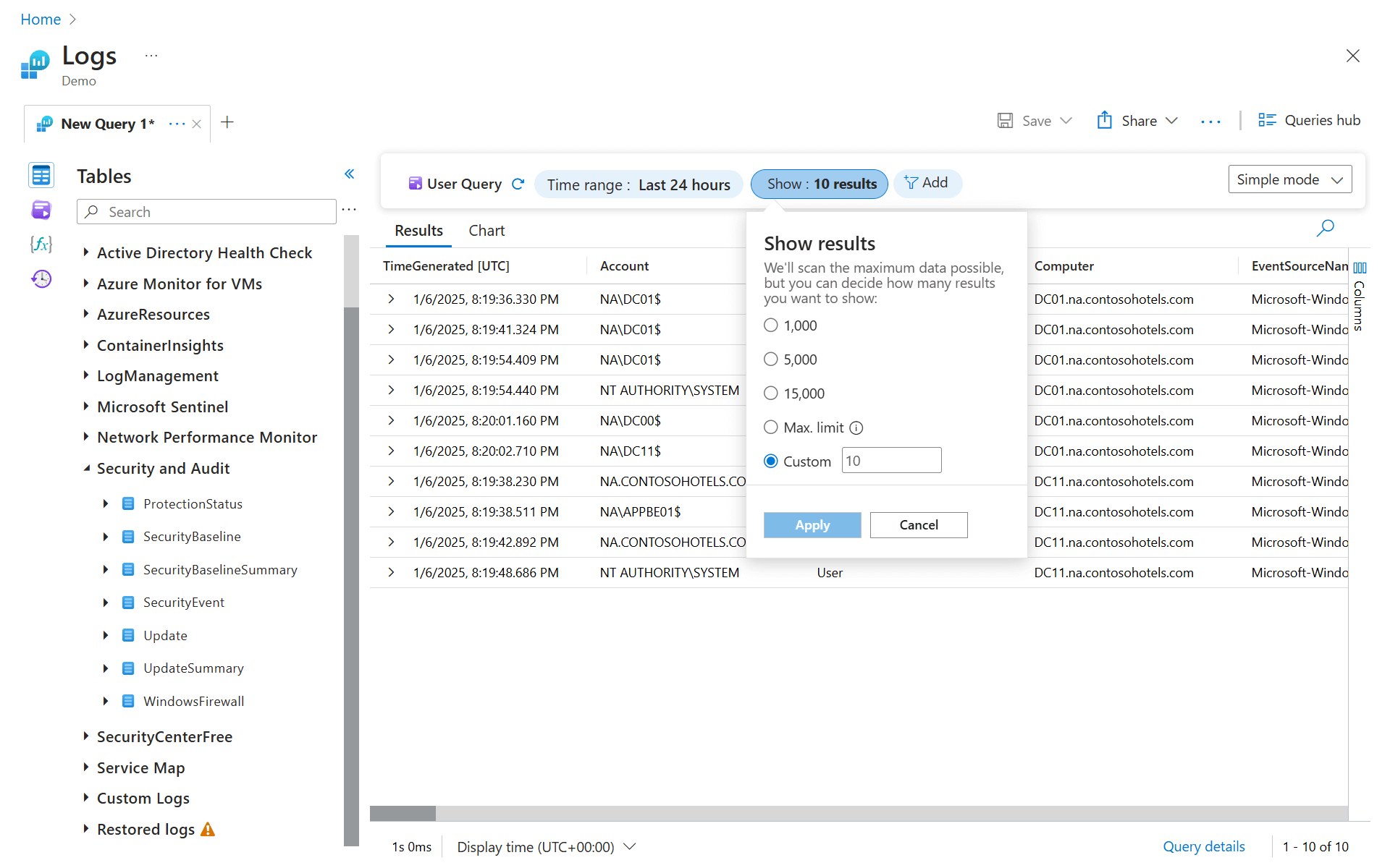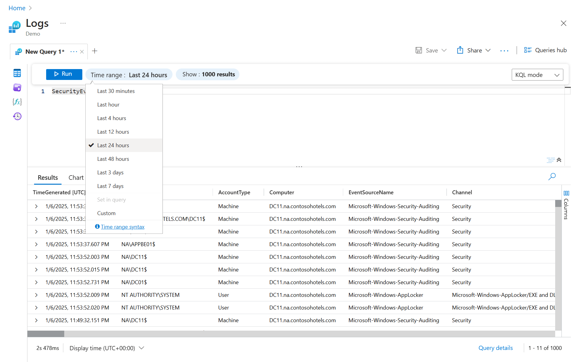 The time picker is displayed next to the Run button and indicates that you're querying records from only the last 24 hours. This default time range is applied to all queries. To get records from only the last hour, select Last hour and then run the query again.