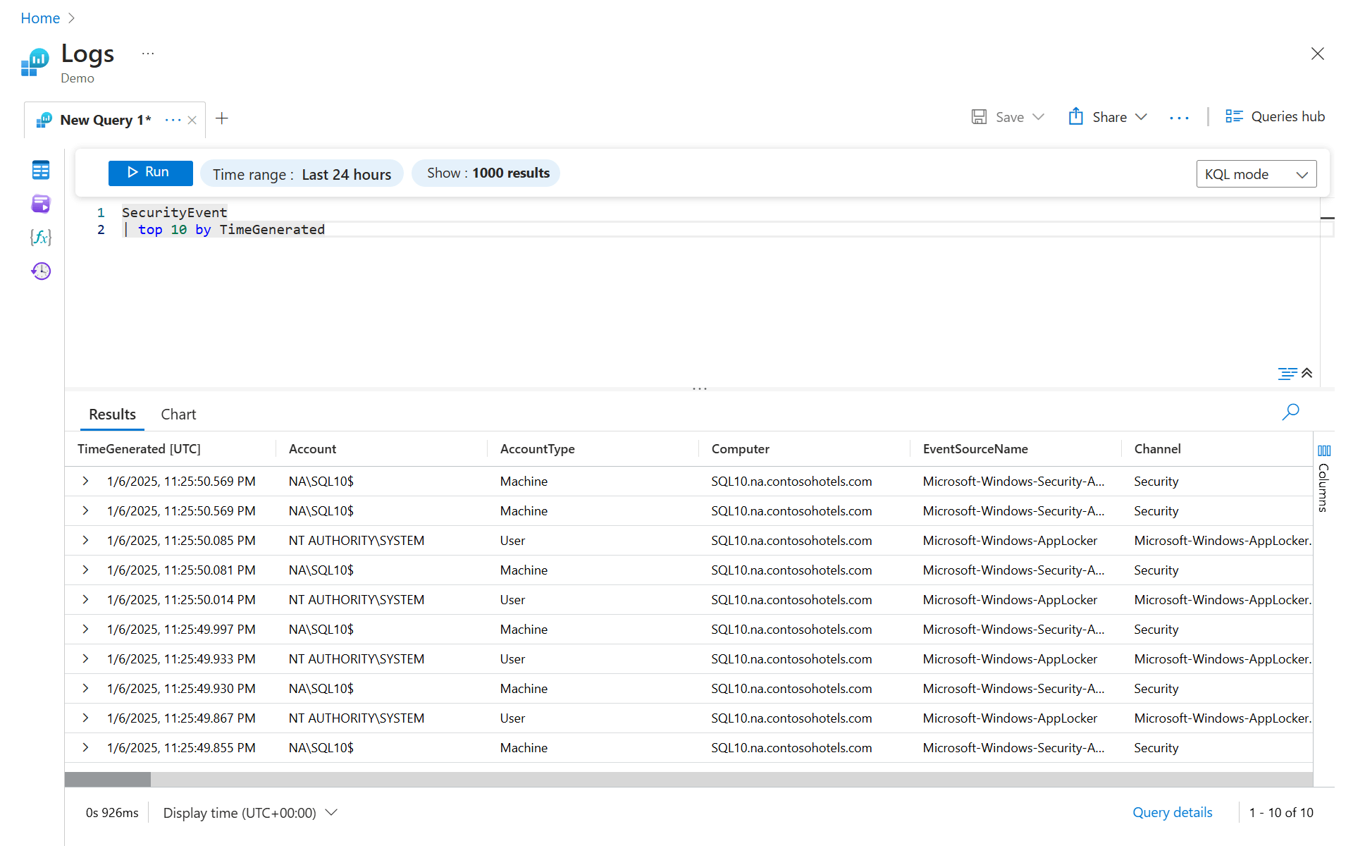 The preceding query returns 10 results from the SecurityEvent table, in no specific order. This common way to get a glance at a table helps you to understand its structure and content. Let's examine how it's built: